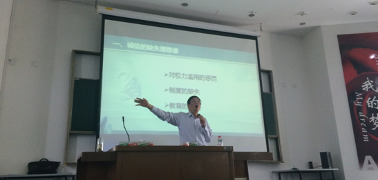 讲座伊始,凌教授先向同学们讲述了当今社会缺失诚信的现状,并深度剖析了是什么造成了当今社会诚信的缺失。凌教授指出,当今这种缺失诚信的现状实质上是对人们滥用权力的惩罚。由于这种对权力的滥用,那些想要说真话的人变得不再敢于说真话,于是,讲真话变成了一种奢侈品。只有当领导们愿意听真话、群众们愿意讲真话的时候,这种现状才可能得到改变。其次,制度的缺失也是造成这种现状的一大原因。现今人们对于诚信的约束,基本上仍停留在道德的约束上,而相关的惩戒条款却并不明确。除此之外,教育的失误也是现如今的人们缺少诚信的一大诱因。公司不能只关注于文化课的学习,也要更加重视对于员工诚信的教育。教育是人类社会化和诚信化的重要机制,任何人生来接受的第一教育内容一定少不了诚信,此后的家庭教育、团伙教育、公司教育、社会教育等更是如此。这种全面系统和强制化的教育机制,就不得不使诚信在人的素质系统中占有基础的根本的地位。而只有当社会中的每一个人都有了诚信的意识,这个社会才会变成一个诚信的社会。