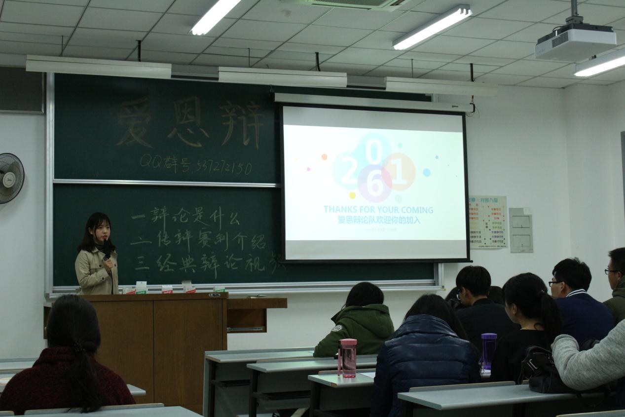 在各班参赛选手抽取完下周三的辩论题目后,许婉婷同学开始向选手们介绍传统辩论赛的规则以及流程。包括“开篇立论”等环节以及四位辩手在这些环节里的主要职责。通过著名的辩论视频——《钱是不是万恶之源》,让选手们熟悉比赛规则,同时也引起了同学们对辩论的热情。