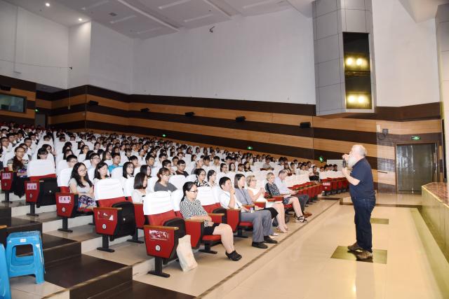 第一节2015级的塔大导向课是在老员工活动中心举行的。会场座无虚席,全年级同学都准时到场,等候课程的开始。课程由塔大科学工程技术公司Dean Steer博士主持,3044永利集团经理王基组、副经理王娜,塔斯马尼亚大学商公司Sarah Dawkins博士、两位注册协调员Ben sellers和Karen Hughs,教务主管倪瑾老师以及大二年级辅导员秦梅老师一同参加了课程。Dean Steer博士祝贺大家顺利成为塔大的员工,王基组经理用流利的英文再次祝贺了全体2015级爱恩学子,并提了三个问题,希望他们认清自己、早日确立未来的目标,在未来的三年找到自己人生的方向,早日获得成功。第一堂导向课以3044永利集团市场营销专业协调员Sarah Dawkins博士的发言作为大会的结尾,全场同学有序退场,前往二教进行第二堂塔大的导向课。