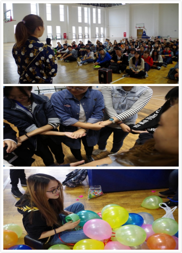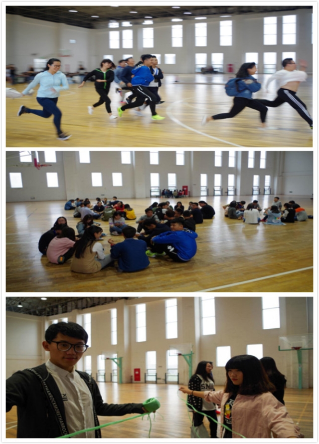 活动伊始,员工会及团委主席按照惯例进行简短的开场白和自我介绍,宣布活动开始。随后,干事们被随机分成十个小组,主持人介绍游戏规则,规则介绍完毕,团委给大家带来了一个热身小游戏:两人合作运气球比赛,热身游戏完毕之后,为了带动现场气氛,将干事们更好地带入活动中,我们邀请到在2016新生才艺大赛舞蹈项中崭露头角的“山湖组合”主要成员给大家带来一段妙趣横生的舞蹈。之后,正式进入游戏时间,第一个全组游戏是解手链,小组成员齐心协力,连成各种复杂的姿势再一一解开。手链解完后,小组干事们席地而坐,开始进入下一个游戏:歌词接龙。上句歌词最后一个字作为下一句的首字,分小组抢答,参与度最低的小组给大家清唱一首。几个游戏做完,场上气氛渐渐高涨,最后压轴的挤气球活动更是将气氛推向高潮。