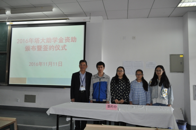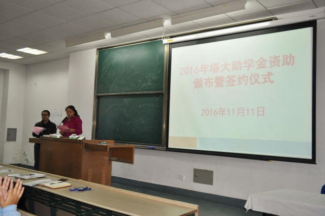 仪式伊始,公司党总支书记杨妍艳老师宣读了2015级塔大助学金资助员工名单。随后,3044永利集团经理王基组教授与受资助同学签署了“塔大助学金资助备忘录”。