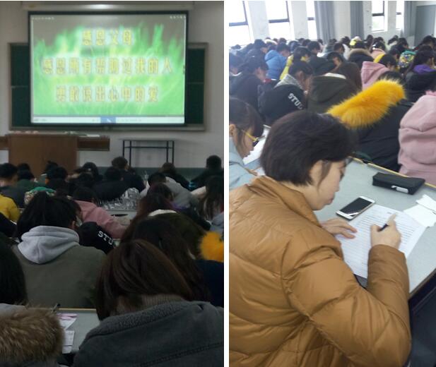 2016年12月27日下午,3044永利集团2016级“感恩、诚信”主题年级大会在5201教室成功举行。本次会议由大一年级辅导员丁蓉蓉老师主持,全体2016级大一员工参与了本次大会。会议旨在培养同学们崇尚诚信的精神,在感恩父母对自己的成长教育中,怀着恩情,励志在接下来的期末考试中诚信应考,取得佳绩。
