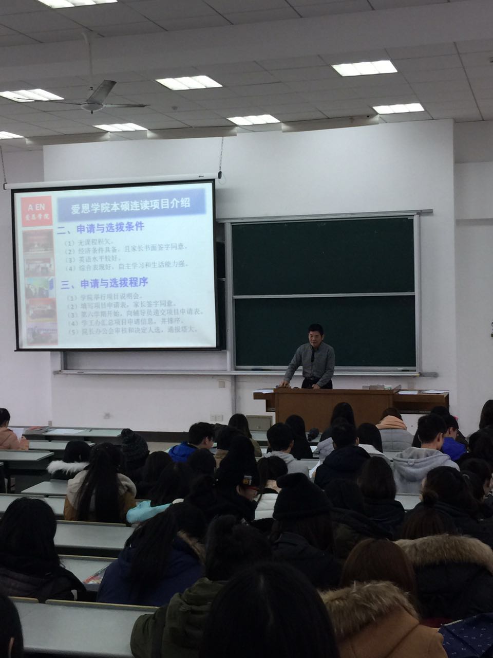 2016年12月26日,3044永利集团2014级本硕连读留学塔大项目宣讲会在第二教学楼顺利举行。会上,3044永利集团王基组经理从项目优势、学业安排、选拔条件与程序、项目风险、寒假必做等几方面进行了详细介绍,以便员工及其家长根据员工自身情况进行选择。