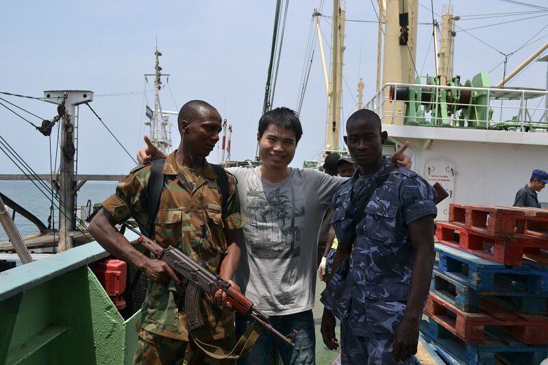 杨森:好呀!王总在爱恩招聘了两位员工,我们第一次出国,从浦东机场出去去了荷兰,阿姆斯特丹,佛得角,又跟着运输船到西班牙,拉斯群岛,之后去了比绍,几内亚塞拉利昂。第一次坐船的好奇感被随之而来的晕眩打破,吐了四天三夜,仅靠喝水度过。最难忘的莫过于生活在几内亚一艘有十个中国人和六个当地黑人的渔船上,我的身份是质检员,职责是审查每艘渔船的加工情况,鱼多的时候我也会跟着水手一起工作。渔船上的生活可谓刻骨铭心啊,我们缺少蔬菜,喝的是蒸馏水,运输船来拉鱼时给你的蔬菜几天就吃完了,每天都是土豆,洋葱,鱼。水手是一个高危职业,头发花白,腰背变驼,渔船上没有日夜之分,几内亚酷热,醒来垫的纸箱都浸湿了,老鼠在身上爬,菜盘上黑压压的苍蝇,船上还有各种臭虫。船上的生活寂寞单调,发疯地想家,只想快点靠岸,每天五点看日落,看到星星出来再开始看星星,有时候还有成百上千可爱的海豚作伴,不仅如此我把能想的都想了,把每个人都想了,极度想回家,除了工作就是望着大海发呆,这也让我现在十分热爱生活,也学会了最重要的吃苦精神!