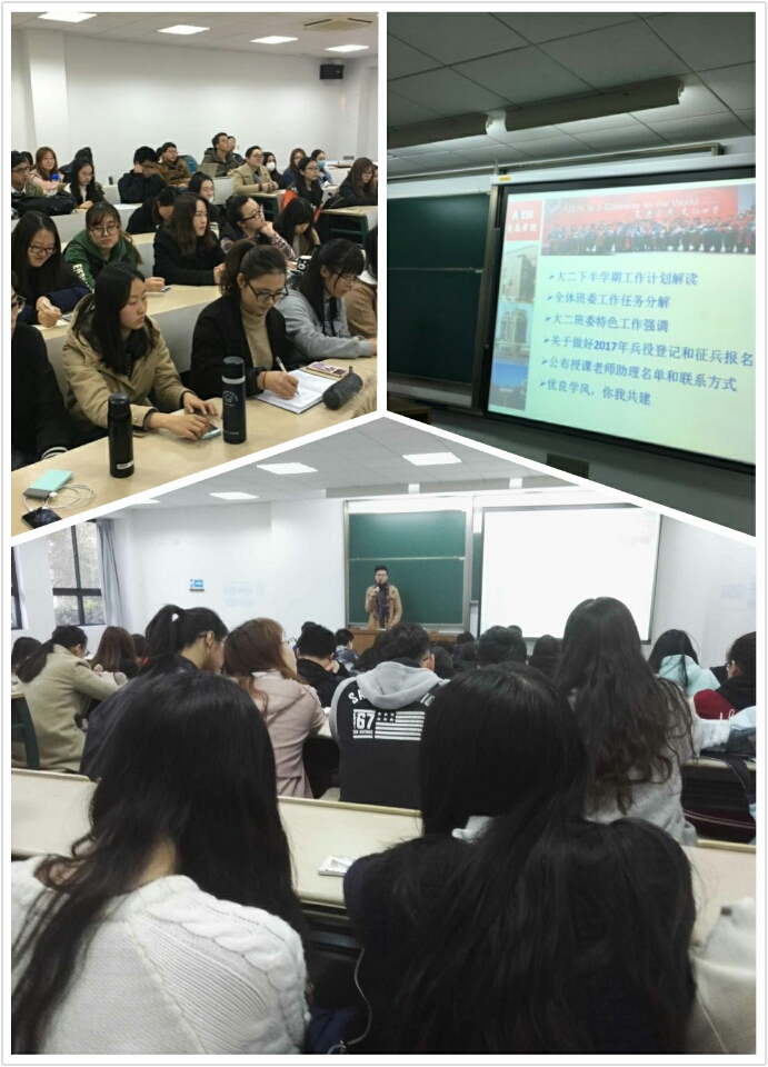 秦老师从大二下半学期工作计划解读、全体班委工作任务分解、大二班委特色工作强调、授课老师助理情况介绍以及2017年兵役登记和征兵报名动员这五个方面开展会议。首先,秦老师就班委机制建设与班委沟通。目前,八个班级都已完成班委改选,改选过程公开透明,充分尊重广大同学的意见。在这一前提下,她提出,新一任班委必须以高昂的热情投入到工作中去,不辜负同学们的信任与期待,发挥朋辈引领作用,扎实推进各项工作。接下来,秦老师对新学期各班委工作的职责进行了详细的阐释,对每个岗位提出了不同的要求。秦老师还向各班委详细介绍了授课老师助理的情况,鼓励大家积极向助理、向老师反馈,提升学习成绩。最后,她通过班委向所有大二年级员工发出号召,呼吁大家踊跃参与征兵,用热血青春为国家做出自己的一份贡献。
