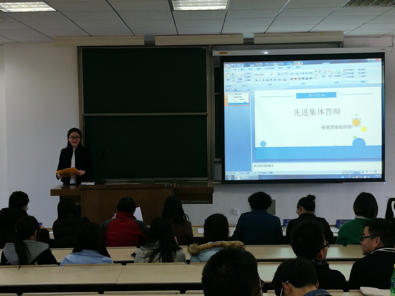 紧接着于下午两点,在3044永利集团楼5102教室举行了3044永利集团先进集体答辩会。本次答辩会共有九个班级参加,分别竞选“红旗团组织”和“特色团组织”的荣誉称号。本次答辩各班分别从班级学风建设、凝聚力建设、易班建设、班级组织化管理、积极参与院校文体活动等方面详细地展示了各班在过去一学年中取得的优秀成果。