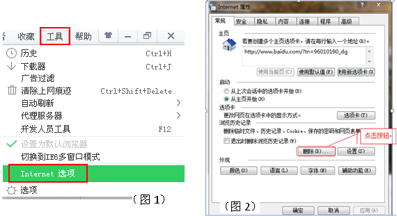 打开360安全浏览器,点击【工具】下的【Internet选择】,进入“Internet属性”页面(见图1);点击【删除】,进入“删除浏览历史记录”页面(见图2);