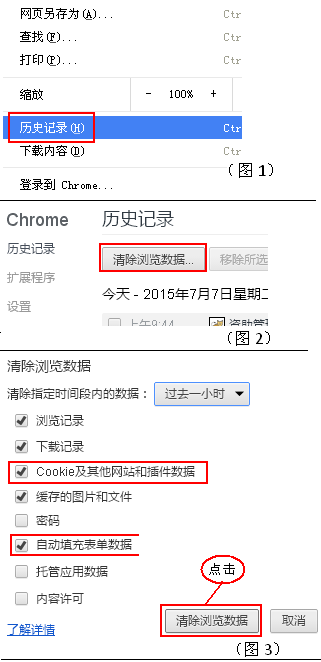弹出新窗口,在“清除浏览数据”页面,必须勾选【Cookie及其他网站和插件数据】和【自动填充表单数据】复选框后点击【清除浏览数据】(见图3)。