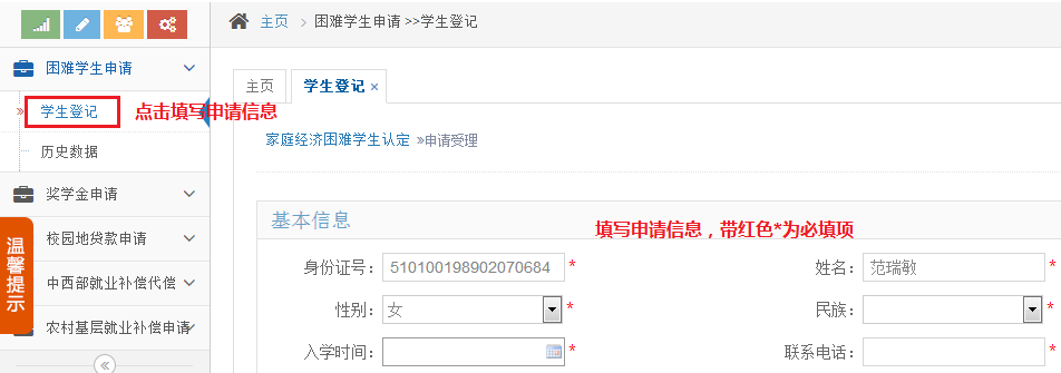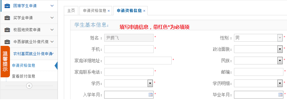 申请说明:在申请励志奖学金前,需要先申请困难生,具体操作请参见Error: Reference source not found家庭经济困难员工认定申请,且高校审核通过后才能申请励志奖学金。