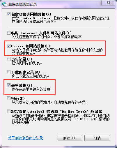 在“删除浏览历史记录”页面,必须勾选【Cookie 和网站数据】和【表单数据】两个复选框,点击【删除】后在“Internet属性”页面点击【确定】即可(见右图)。