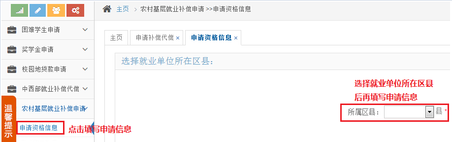 说明:如果该员工已经在中西部就业补偿代偿中填写了申请,则在农村基层就业中就不能再次申请。