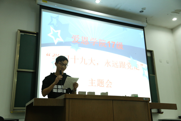 主题会由主题演讲和“班班有歌声”两个部分组成,2017级各班同学热情高涨,各显其能。演讲共分“学习十九大精神”“将改革进行到底”和“我的奋斗目标”三个主题,每班选派三位同学分别畅谈对每个主题的见解,大家准备充分,各有千秋。每位同学都选定了一个独特的角度,见微知著,谈了各自对十九大的认识。不少同学将十九大精神、改革政策与个人学习生活目标相结合,展现了当代老员工积极关心国家大事的热情与将国事作为己任,为祖国发展贡献力量的决心。“班班有歌声”活动将主题会推向高潮,各班摩拳擦掌,集体上阵。有的班将手语与歌唱相结合,有的班进行了现场配乐。每位同学都全情投入,放声歌唱,现场呼声阵阵,气氛尤为热烈。