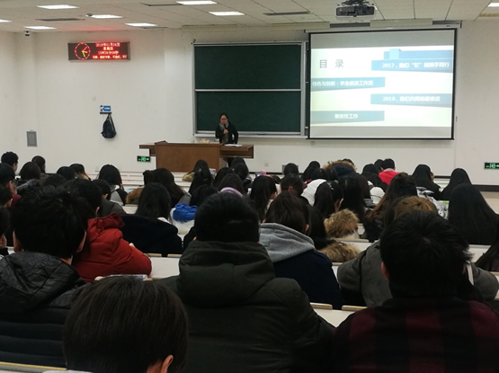 会上,秦老师首先向一直为年级工作做出无私奉献的各位班委、学习负责人以及所有支持公司工作的同学表达了感谢,并回顾了整个学期以来大家在多方面展现的风采,对在服务、学习、献血、志愿者服务、体育、科创等各方面表现突出的优秀个人、优秀集体进行了表彰;同时也带领大家回顾总结了大二年级开展的各项活动,如 “学习十九大,永远跟党走”的主题班会、团队辅导之生涯意识唤醒等内容,并向大家展示了本学期以来爱恩公司“学业促进工作室”开展的各种学风引领活动,通过问卷调查的方式征集了解意见,希望能集思广益,不断完善活动内容,力求给各位同学提供更方便更精准的服务。