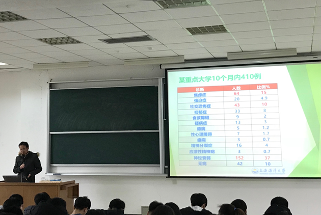 两位老师的讲座分别从“心理问题”的定义和“健康”一词的定义进行展开。首先介绍了“健康”一词涵盖的范围,平时我们常说的健康都是指身体健康,健康状况通常也认为有无生理疾病,其实健康还包括了心理方面的问题。紧接着,给同学们指出了某重点大学10个月内出现的410例心理问题,告诉大家心理问题是常见的,掌握自我调节的方法,优化心理素质,提高挫折承受力,即可避免心理疾病的发生。随后,为了让员工们及时地认知常见的心理问题,并采取相应干预措施,又给大家讲解了老员工常出现的心理疾病,如抑郁症、精神分裂、多重人格、超现实主义等。