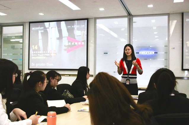 此次参观受到公司HR部门贺丽女士和宋晓陆先生热情接待。贺女士和宋先生就埃森哲公司的企业文化、五大业务领域以及对人才的需求为同学们做了详细的介绍。座谈会上同学们也纷纷抛出了或是专业应用前景问题或是目前需要储备的能力等问题,贺女士亲切地为同学们一一做了解答,并提醒同学们在校期间一定要注重多方面能力培养:企业需要的是硬实力必须与软实力相结合的人才,即结合埃森哲的用人情况来看,技术、语言和行业知识必须过硬,同时沟通、合作与思维能力等非认知能力也缺一不可。当然,爱和开放创新的精神更是必不可少。座谈会最后贺女士鼓励同学们要把公司教的知识弄懂学通会用,思考清楚自己想要什么,朝着理想而努力。