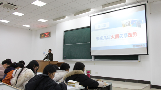 课堂从大国关系新变化及其原因、未来几年大国关系走势和应对大国关系变迁的中国之策这三个层次循序渐进,让在座的同学们都对当今的大国关系有了宏观的认识。王经理在讲课过程中穿插了许多的时事政治热点来辅助教学,使课堂气氛一直很轻松活跃。