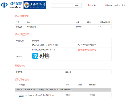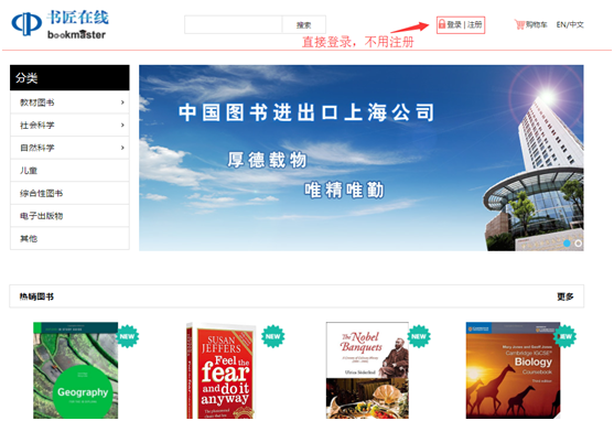 中国图书进出口上海公司是经过公司2017年秋—2020年春教材供应招标工作确定的供书单位,将为公司员工提供中外文图书的征订和购买服务。请各位同学到其官网www.bookmasteronline.com,按照下面操作流程进行教材的购买。