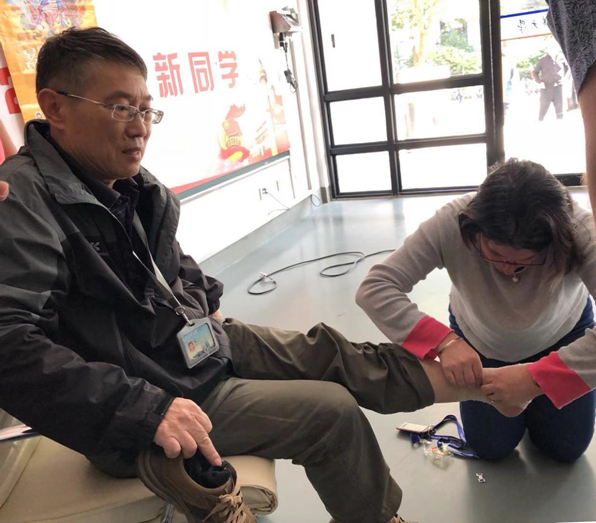 10月31日中午时分,公司郝玉明老师在三餐食堂吃好午饭下楼梯的时候,一脚踏空把左脚扭了,当时疼痛难忍,根本无法站立,一起下楼的朱立群老师和孙晓昕老师,马上把他抬到公司西头大厅休息,在等出租车的过程中,席朝茜老师找来冰块给郝老师敷上;路过的塔大老师Erin看见了,马上飞奔上楼,从办公室里取来绷带为郝老师包扎好,动作娴熟得俨然像个医生。不一会儿,车子到了, 郝玉明老师到医院进行检查和治疗,检查结果告知,骨头无大碍,大家都松了一口气。