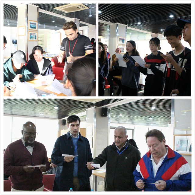 活动伊始,主持人详细介绍了活动规则及注意事项,并采取随机分组的方法将同学们分成五组,一同参与之后的活动环节。首先进行的是“英语绕口令”,同学们根据分发的绕口令内容,以接力的方式用最快的速度清晰地完成绕口令的朗读。外教老师们也参与其中,与同学们一起感受“英文绕口令”的表达乐趣。随后是“英文配音”环节。这一环节中,每个小组挑选各自英文电影配音素材,通过外教老师们的帮助与指导,成员们展示出了不一样的特点与风采,将学习、模仿能力表现得淋漓尽致。最后一个环节是“自由问答”,每位外教老师向同学们随机提出几道问题,题目内容涉及生活、历史、学习等方面。同学们踊跃发言,而外教老师们风趣幽默的表达方式更是让现场掌声、欢呼声不断。