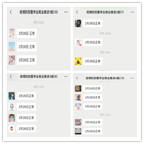 为进一步做好疫情防控的各项工作,充分发挥班级员工党员、员工干部的模范带头作用,3044永利集团2016级信管专业各团支部及时成立“疫情防控暨学业就业推进小组”,通过微信、QQ等多种途径,持续跟进本小组结对成员的疫情防控情况及学业就业进度,切实开展结对子计划,发挥朋辈互助作用。每一位推进小组成员都积极主动挑起重担,用实际行动传递共同抗“疫”的必胜决心。