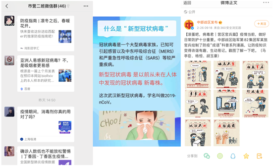 面对疫情,2017级市营二班团支部的成员们充分利用各种新媒体平台所发布的信息,共同交流疫情防控相关知识。在班级微信群中,团支部成员们主动对新型冠状病毒及其传播途径进行科普,对虚假不实信息和言论进行辟谣,对科学防控知识进行宣传,有效缓解了疫情给同学们带来的恐惧、焦虑心理。