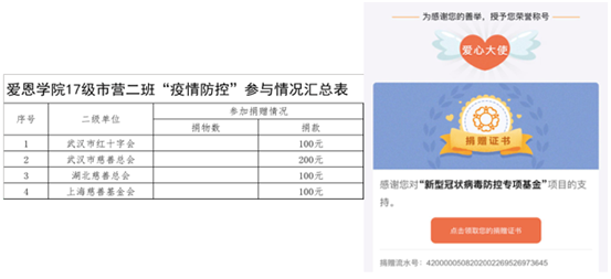 平凡中见真情,大事前看担当。面对来势汹汹的疫情,2017级市营二班的团员们科学有序地参与到疫情防控工作中去:部分同学参与了防疫志愿者活动,帮助宣传防疫知识或在社区排查;部分同学向相关机构捐款、捐物,为坚决遏制疫情扩散、夺取防控斗争胜利贡献青春力量。