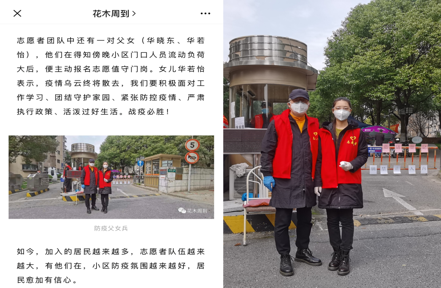 体温测量、“随申码”核查、外来车辆管控、人员身份甄别,每一个具体的行动,换来了小区的平安与和谐;礼貌周到、一丝不苟的服务态度,乐观阳光、积极向上的精神面貌,获得了居民的广泛好评和赞誉。为此,《花木周到》以“盛世一家亲 防疫父女兵”为标题对她和父亲的志愿者事迹作了相关报道。