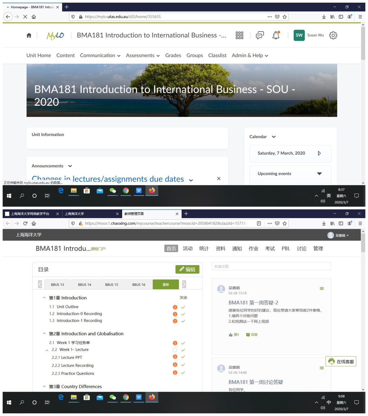 《国际商务基础(澳)》这门课是合作办学引进塔斯马尼亚大学的一门专业课程,全英文授课,对于员工而言有一定难度。这门课程教学分为大课、小课模式,大课主要是老师讲解一些基本原理,员工听。小课时要求员工根据所学的原理对一个问题或案例进行分析,要求员工讲,老师听。鉴于这一课程特点,在这门课线上教学模式的设计中,吴蓉娟选择了“泛雅教学平台讲解知识点+MyLO平台作业考核+腾讯会议集中答疑+QQ群实时咨询”的“四合一”教学模式。