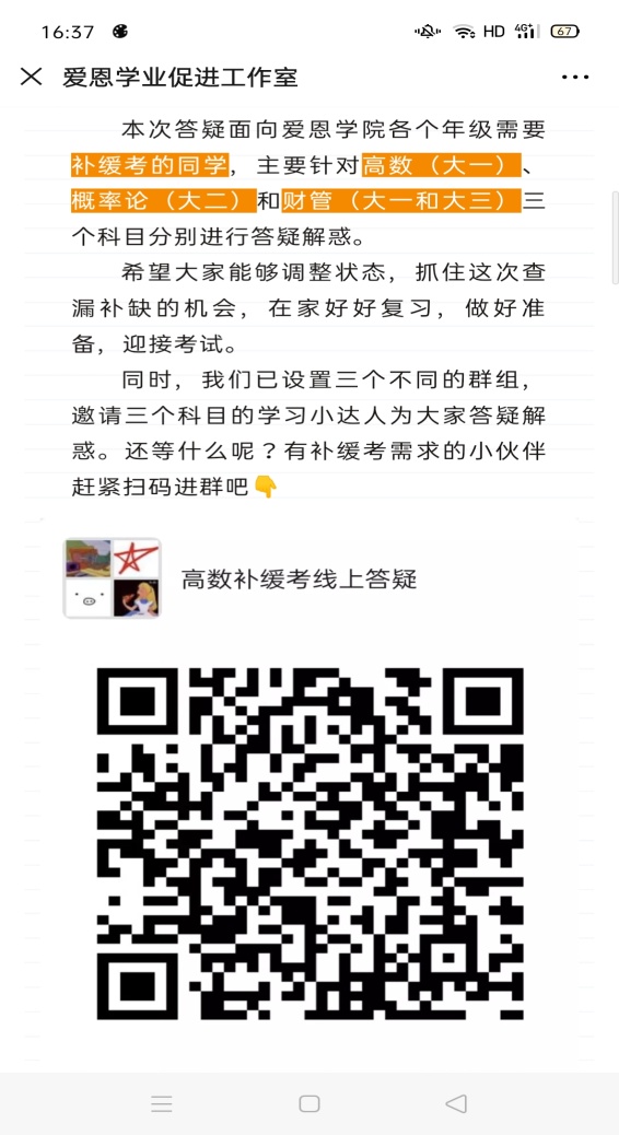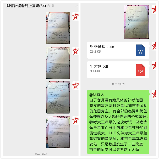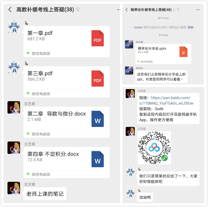秉持“有针对、增实效”的辅导理念,在各年级辅导员的细致排摸下,补缓考课程答疑群依次建立。任课教师担任总指导,成绩优异、乐于分享的四到六位“学霸”组成答疑小组,有补缓考需求的同学自愿扫码入群。活动一经推出,便在院内引发热烈反响,共计170余人次参与群内学习。通过精心筹备,答疑小组根据各科期末考试内容及补缓考范围提炼“重点”、剖析“难点”,以图片、文档等形式分享在群中,供同学们随时查阅与学习。详实的资料、耐心的解答、专业的指导……“助力计划”因需而设,同学们受益颇丰,点赞不停。