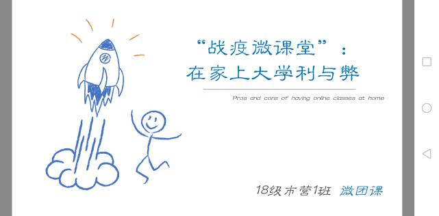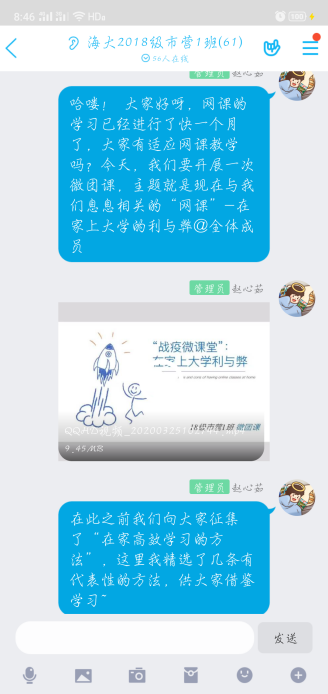 为进一步加强广大团员青年的责任意识,激发担当精神,为坚决打赢疫情防控的人民战争、总体战、阻击战奠定坚实基础,深入推进爱国主义教育,在团员青年中厚植爱国主义情怀,2018级市营1班团支部积极响应校团委号召,开展“疫情防控青年说”主题微团课,鼓励团员员工就“云课堂开展的利与弊”谈感受、讲体会,以期在交流互动中帮助同学更好适应网络教学,提高学习效率。