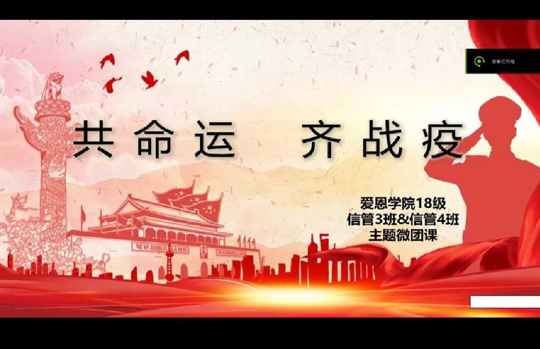 为坚决打赢疫情防控的人民战争、总体战、阻击战,进一步激发广大团员青年的责任担当,2018级信息管理与信息系统第四团支部积极响应校团委号召,组织开展以“人类命运共同体下的防疫抗疫合作”为主题的“疫情防控青年说”主题微团课。