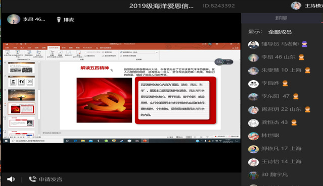本次线上主题团日活动积极引导2019级信管3班的成员们树立和践行社会主义核心价值观,勉励青年团员们珍惜韶华,担负起时代赋予的重任,让青春在党和人民最需要的地方绽放绚丽之花。