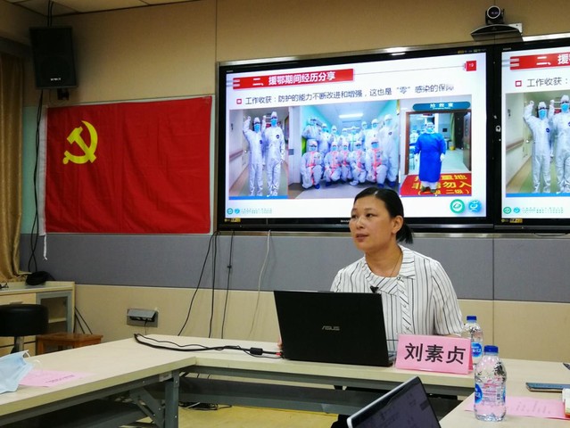 刘素贞以《与爱同行,共克时艰》为题分享了她的战“疫”之路。从大年初四义无反顾剪掉长发奔赴前线到起雾的护目镜,汗水一遍一遍浸湿的防护服;从初到武汉看到空荡街道的沉重到看到患者病情好转治愈出院的欣喜;从作战前严肃认真的培训到投入到重症监护室繁重的护理工作;从社会各界给予的关心和支持到工作中建立的深厚友情……刘素贞护士长给全院师生分享了在武汉疫情一线坚守55天内的一个个难忘时刻,讲到动情之处,刘护士长声音哽咽,师生党员眼里也泛着泪水。大家在交流中谈到,2020年,对我们国家来说是极为不平凡的一年,新冠疫情突如其来,无数勇敢的白衣天使无惧风雨,不畏艰险,迎难而上,勇敢“逆行”,在抗“疫”第一线与死神争斗,以较高的治愈率和较低的病亡率创造了抗击重大传染病的“中国奇迹”。从刘护士长精彩的讲述中,与会党员都深切地感受到了医务人员同时间赛跑,与病魔较量,坚决打赢疫情防控阻击战的决心,体会到了白衣天使用实际行动和专业精神诠释“人民至上、生命至上”的医者仁心和人间大爱。与会党员纷纷表示,随着四史学习地不断深入,会将战“疫”精神转化为实际行动,坚定理想信念,不忘初心,牢记使命,立足本职岗位,发挥党员先锋模范作用,走好新时代的长征路。