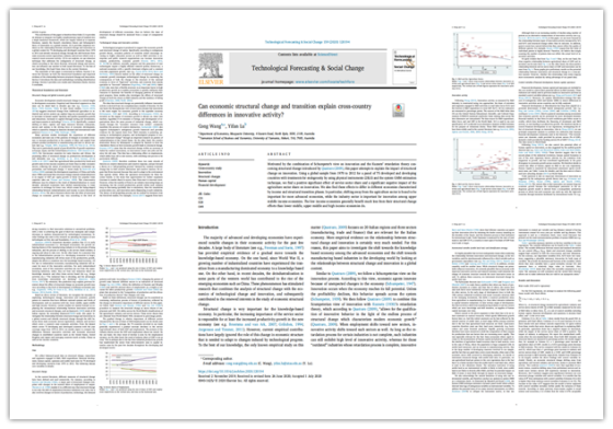 2020年,陆逸凡与合作者在国际英文学术期刊《技术预测和社会变革(Technological Forecasting and Social Change)》上发表了一篇名为“Can economicstructural change and transition explain cross-country differences ininnovative activity?(经济结构变化和转型能否解释创新活动中的跨国差异?)”的论文。该文以全球75个经济体为样本,完成了“经济结构转型对创新研究活动影响”的实证研究。