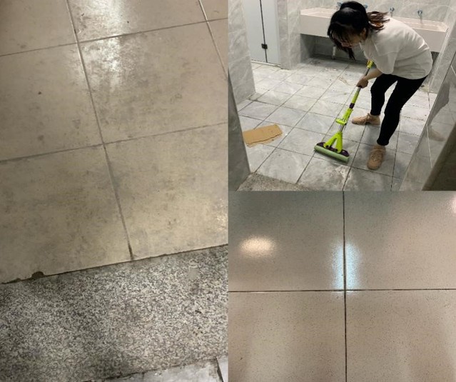 (图为支部成员周嘉宁在清洁卫生间的瓷砖地板)