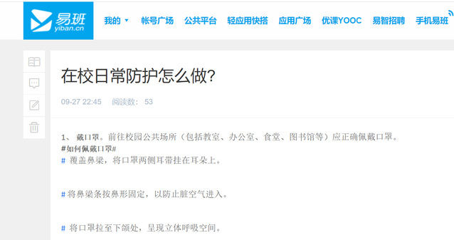 本次团日活动多措并举,对团支部成员开展防控法规和制度、个人防护与消毒等知识的培训,以切实加强疫情防控知识的宣传教育,普及具体的防疫做法。会前,宣传委员胥君玥在易班平台发布校园日常防护小贴士,以及由团支书朱雯慧与之共同拍摄、制作的“专业洗手七步法”防疫视频。