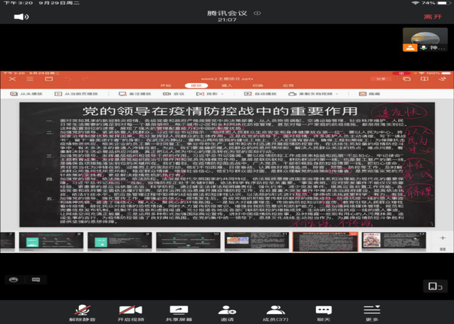 班长李昂主持腾讯会议、开展线上宣讲,向团支部成员介绍中国共产党在疫情防控斗争中所采取的举措;结合视频《疫情下的平凡力量》,他带领团支部成员一同学习在疫情防控工作中涌现出的优秀典型;为响应垃圾分类号召,生活委员龚恒杰为同学们详细讲解了垃圾分类的相关知识,进一步加深支部成员们对垃圾分类工作的认识,从而身体力行地履行分类义务。