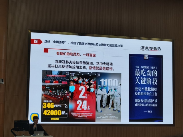 本次形势与政策课,李玉铭从多个角度展现了抗击新冠肺炎疫情的中国行动、书写的“中国答卷”;记录中国人民的艰苦奋斗;见证中华民族的坚韧顽强;彰显中国的制度优势和治理能力,中国共产党的英明领导和科学决策;书写命运与共的责任与担当。
