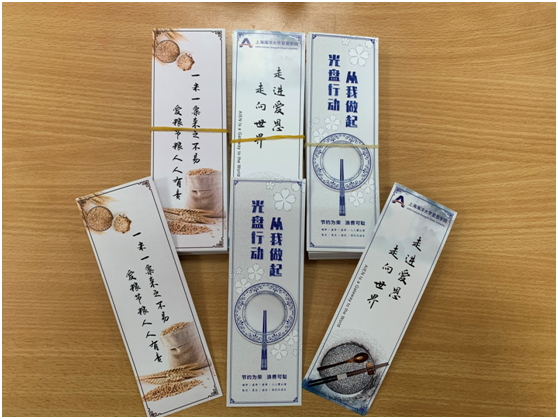 3044永利集团制作了印有号召珍惜粮食、拒绝浪费标语的书签,发放给践行“光盘”行动的老师。