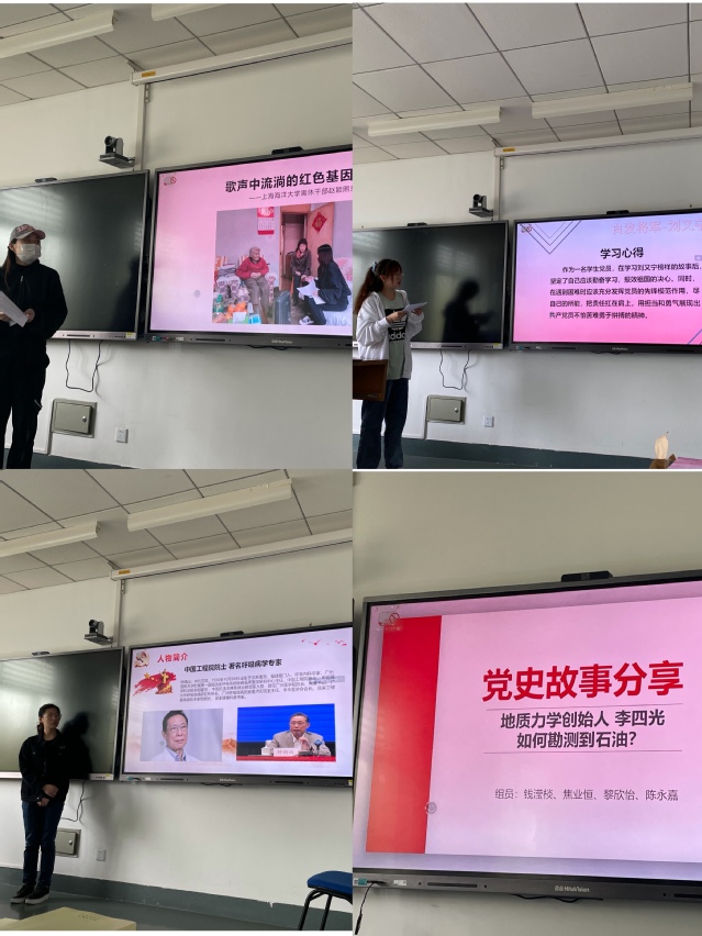 贾诗倩分享了为祖国科技事业和国防建设作出重要贡献的“两弹元勋”——郭永怀的故事;李馨月则带来了钟南山院士留学后毅然归国,亲自挂帅出征,冲锋在抗疫前线的故事;钱滢棪分享了地质力学创始人李四光通过艰苦奋斗寻找开辟新油田,改变我国石油工业落后现状的故事;赵子琦分享了白发将士刘又宁先后奔赴汶川地震救灾、新冠肺炎疫情救治第一线的故事。通过分享,党员们深刻领会到国家的发展,祖国的建设离不开党员前赴后继,舍小家为大家的拼搏和努力。