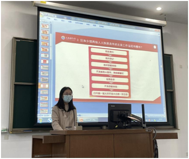 首先,兰璐从选民登记方面切入,阐述了行使选举权的重要性与必要性。随后,她逐一地介绍了两位候选人的具体信息,鼓励同学们要理性且庄重地行使自己的选举权利,选出心目中最合适的人大代表。