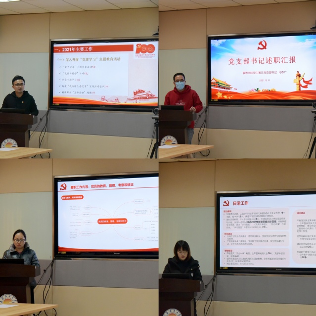 会上,公司师生党支部书记主要围绕日常工作和年度重点工作,介绍了支部在政治建设、思想建设、组织建设、作风建设、纪律建设中履行党建第一责任人职责情况,推动党史学习教育和完成重点任务情况。并分析了工作中存在的问题和努力方向。