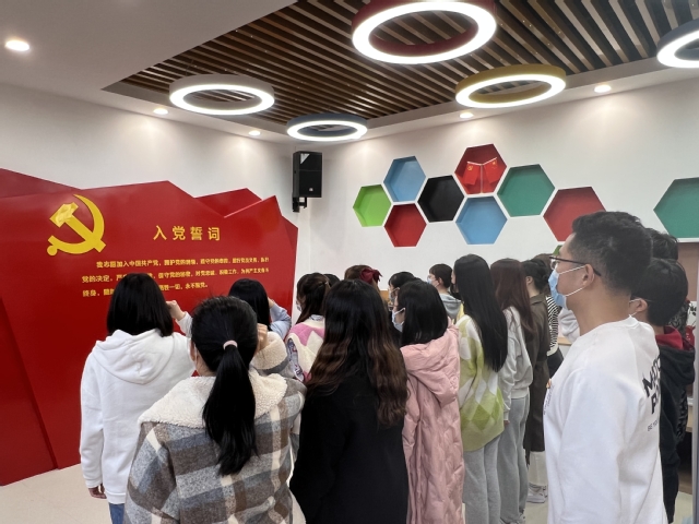 随后举行新发展党员入党宣誓仪式。伴随着雄伟的《国际歌》,宣誓仪式正式拉开帷幕。党支部书记马春广为新发展党员发放党章、佩戴党徽,并提出了三点期望:第一,要加强党的理论知识学习,将党史学习落到实处;第二,要加强党性修养,提高自身素质,做到组织上入党与思想上入党的有机统一;第三,要自觉以党员标准严格要求自己,切实发挥好先锋模范作用。在支部宣传委员席朝茜的领誓下,党员们面对鲜红的党旗,举起右拳许下铮铮誓言。
