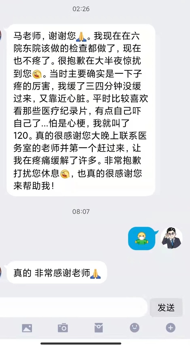 3月9日凌晨,2019级信息管理与信息系统专业辅导员马春广处理了两起员工的突发状况,接到员工的电话后,他第一时间赶往寝室,在帮助员工顺利就医后,他说:“虽然比较劳累,但是员工都转危为安,尤其是收到员工发来的感谢信息,一切的辛苦都值得!”