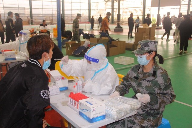 员工第三党支部员工党员方梓聿协助医护人员进行核酸检测