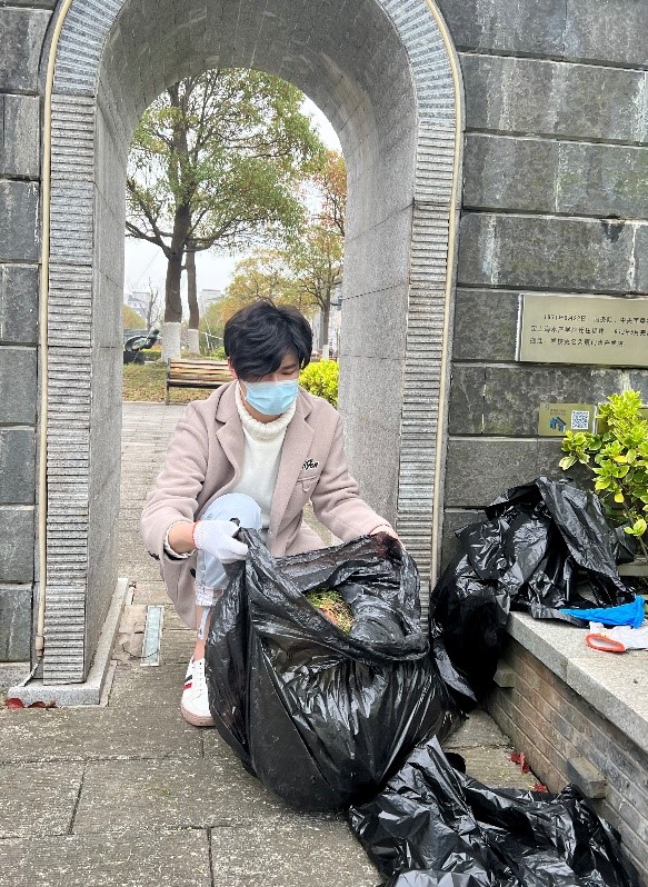 员工第三党支部员工党员孙笠程正在捡拾校园垃圾