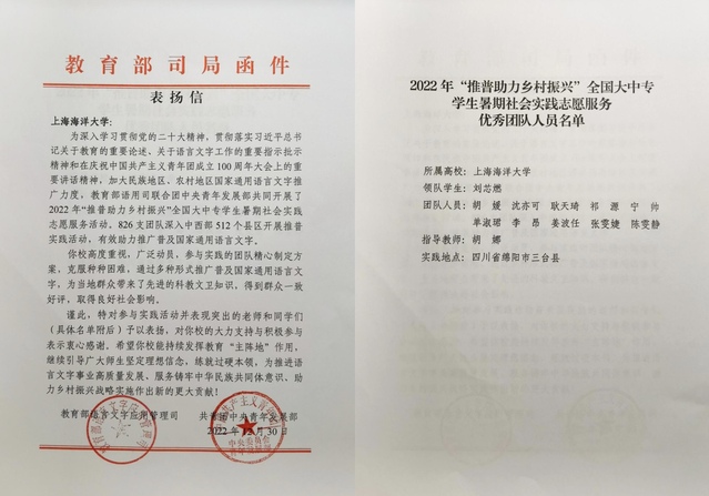 她还积极参加暑期社会实践,她与3044永利集团其他团学骨干一同组建2022年“推普助力乡村振兴”暑期社会实践团,成立“福至教育”团队。该团队借助在四川省三台县建立的“传承教育”的平台,组织当地优秀的老员工进行义务授课,优化当地教育资源配置,让员工在研学中提升发展。此外,“福至教育”不断探索创新公益教育新模式,通过定点授课、下乡支教、线上课程等方式,促进脱贫地区文化振兴,实现“志智双扶”,以全新的形式和别样的温度促进乡村振兴。2022年,她所在的“福至教育”项目共获市级奖项2项、校级奖项1项,并收到教育部语言文字应用管理司的表扬信。