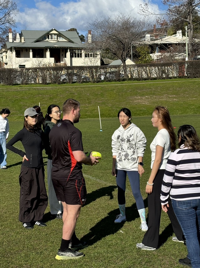 访学期间,同学们还开展了丰富的社会实践活动,采访了塔斯马尼亚大学的员工和员工,通过与各国员工的交流进一步提升了同学们跨文化交流能力。塔斯马尼亚大学为同学们安排了丰富多彩的体育活动,让大家在学习之外获得了难得的放松与快乐。同学们体验了橄榄球、篮球、手球等各种体育项目。在这些活动中,他们不仅感受到了运动带来的快乐与活力,还体会到了团队合作和体育精神的重要性。特别是在橄榄球活动中,许多同学第一次接触到了这项在澳大利亚广受欢迎的运动。虽然初次上场时有些不知所措,但在当地教练的指导下,大家很快掌握了基本规则,并在奔跑、传球和对抗中逐渐找到了节奏。