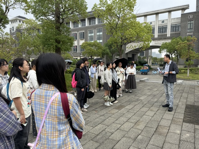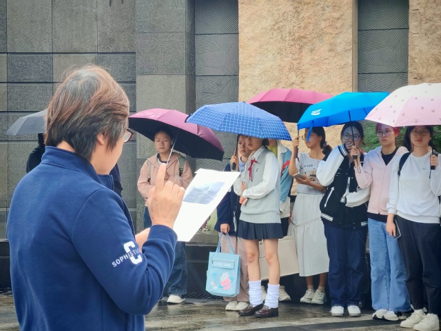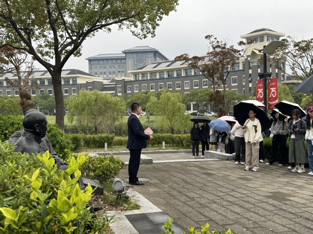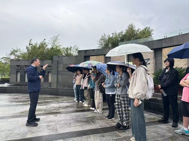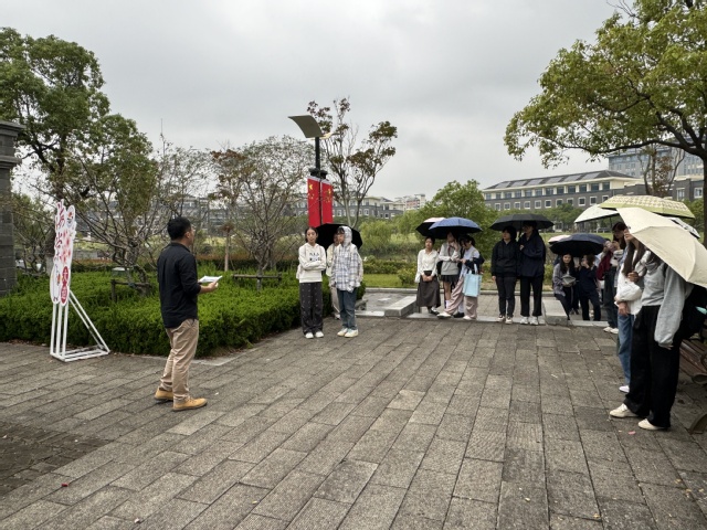 沿着朝海路,穿过七道校门,驻足张闻天坐像、创校先贤雕塑、元鼎骨、复校石等一个个承载着公司历史印记的地标,公司党委副书记李先仁、专任教师丁其磊、陈文渊和员工讲解员一起,向同学们解读了“渔界所至 海权所在”创校使命,回顾了公司筚路蓝缕的发展历程,重温了一代代海大人服务国家海洋、水产事业发展的精彩故事,伴着细雨,同学们仿佛跨越了时空,近距离感悟着海大深厚的文化底蕴和精神追求。